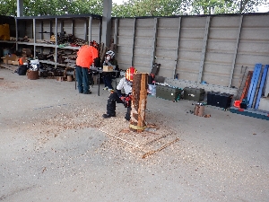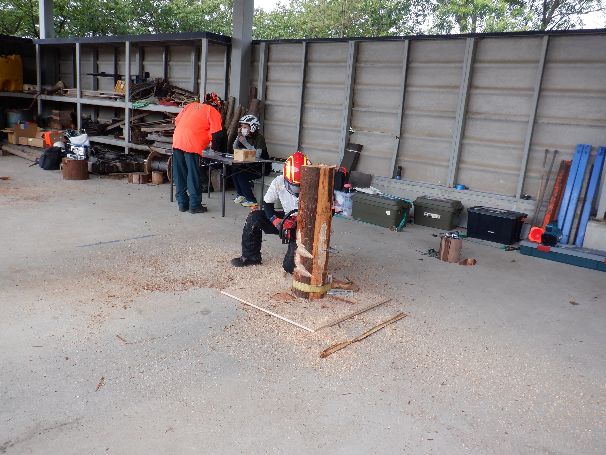 研修では、普段の業務の中で当たりまえに行われているチェーンソーによる伐倒や造材の安全に配慮したやり方や、安全に作業するための防護衣や防護ブーツの着用の重要性などを確認しました。
