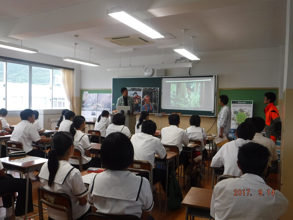 平成29年9月14日(木)長崎県上五島高校で開催された「農林水産業説明会」に参加しました。上五島高校の1年生(113名)を対象に林業へ興味を持ってもらうため、森林の仕事を説明しました。